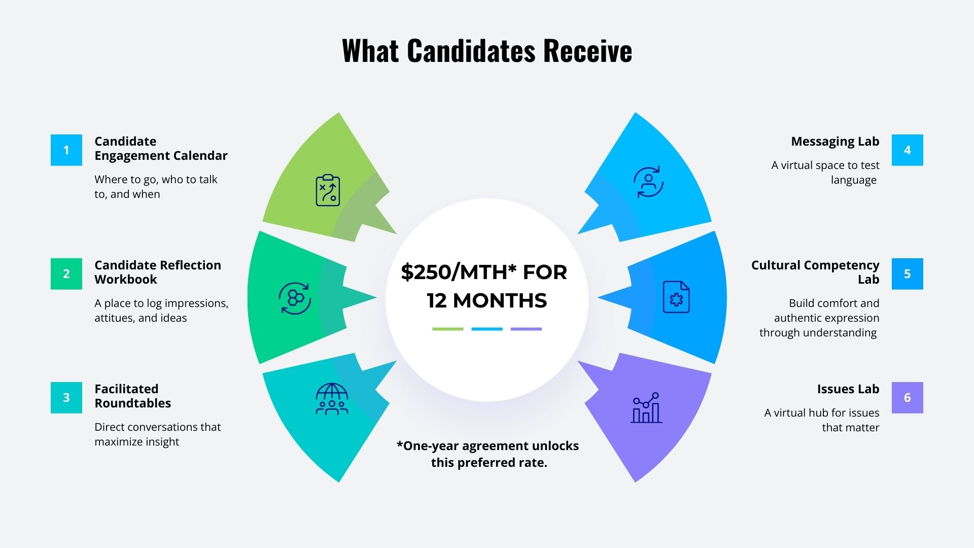 $250 per month unlocks strategic guidance and tools most campaigns pay thousands for before, during, and after Election Day.