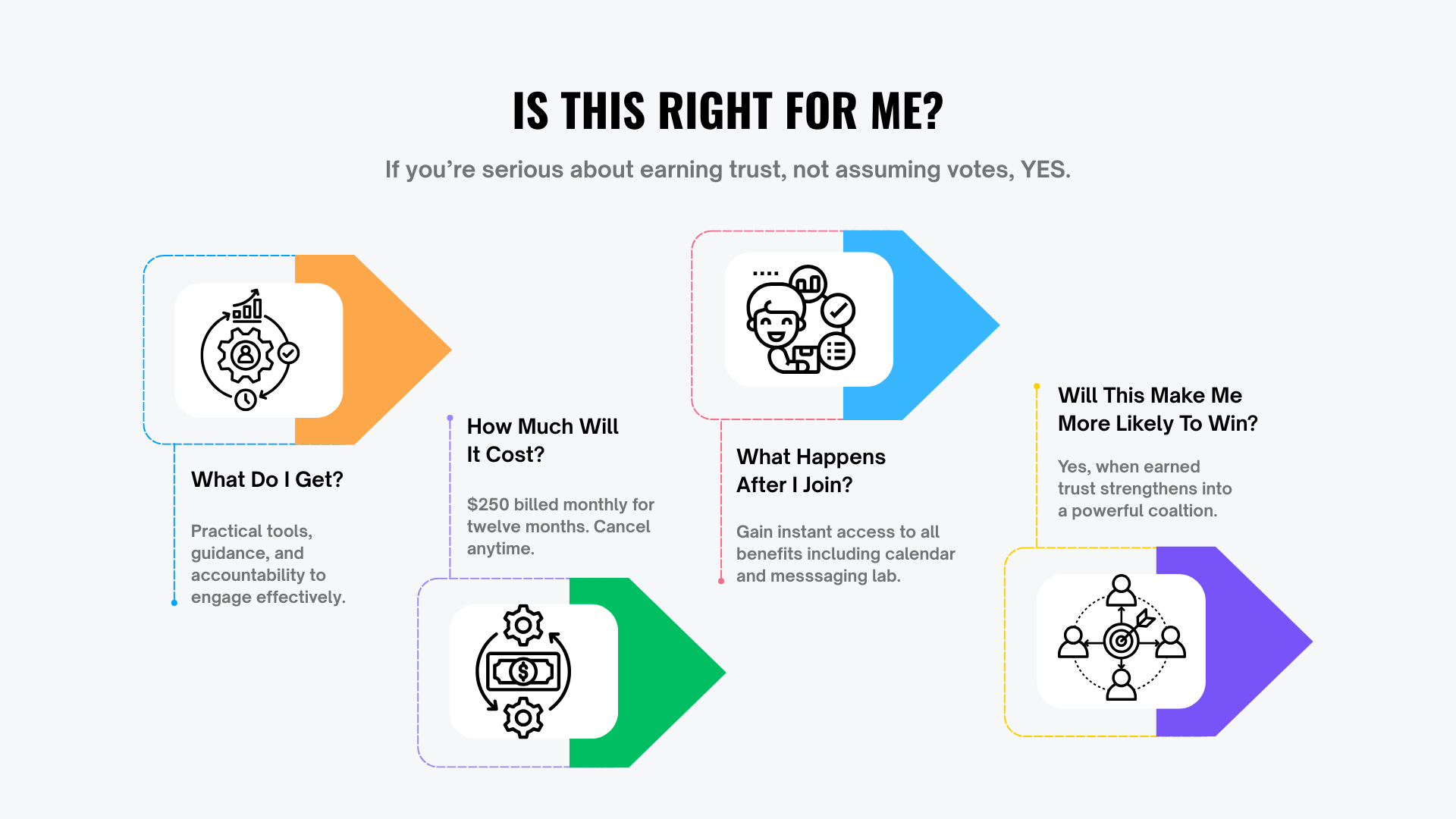 Membership gives you the systems, guidance, and strategic edge to turn trust into turnout, not just good intentions.
